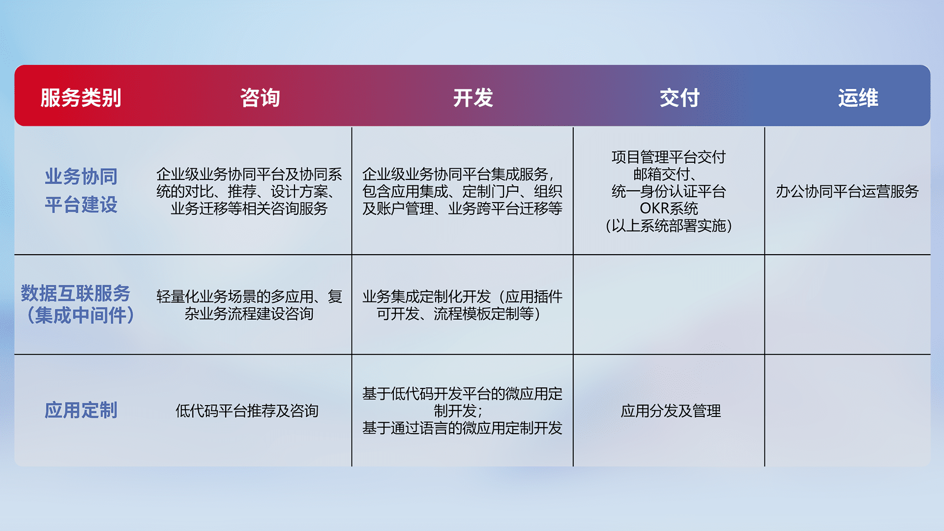 针对钉钉、、、、企微、、IDaas等平台级产品提供产品的规划、、方案、、、、交付、、、定制化开发等服务,,,,实现如统一协同办公、、智能客户服务、、、、混合会议管理、、智能数据查询、、、等业务场景,,实现数字化转型。。。。