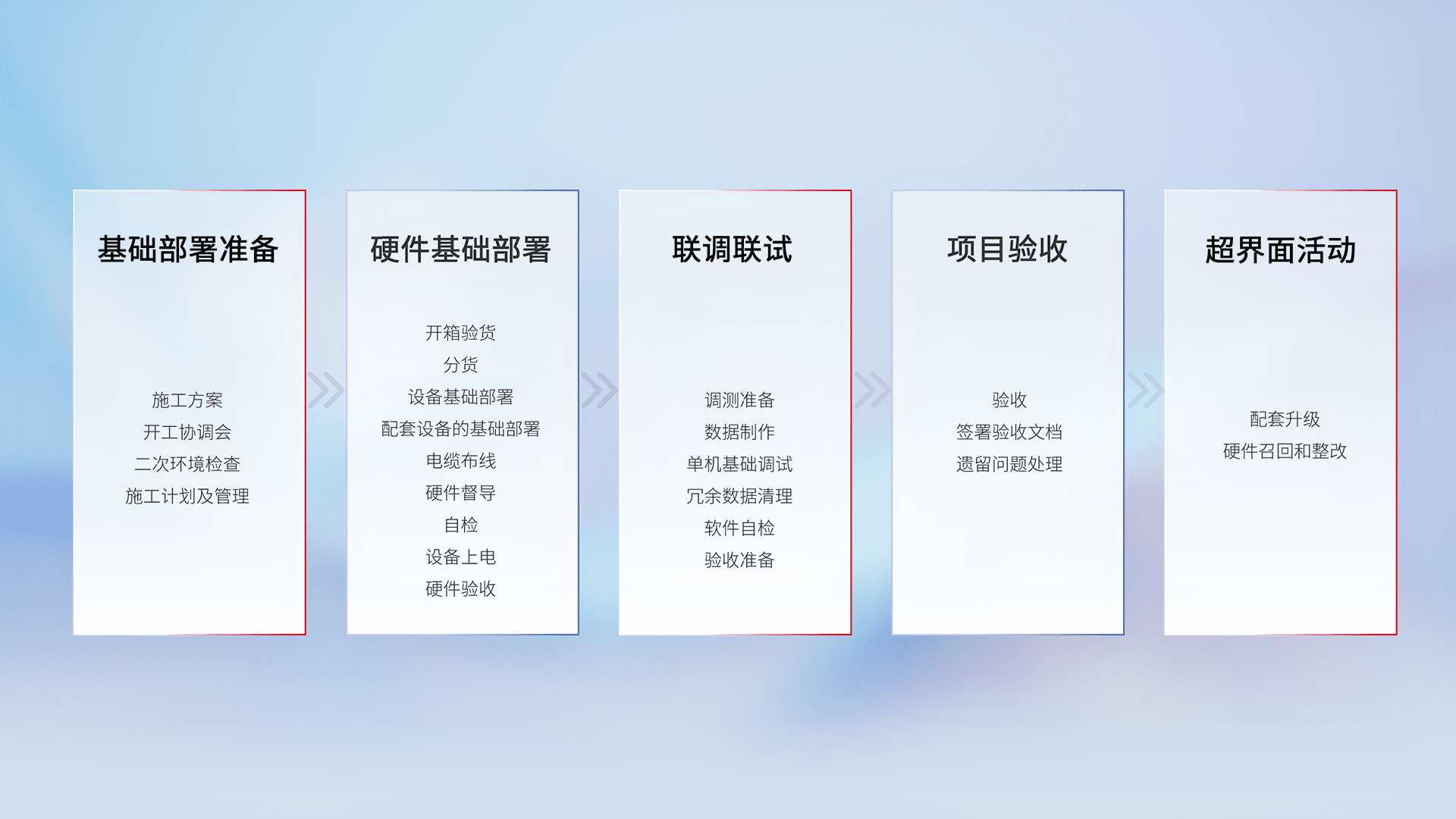 从基础部署准备、、硬件基础部署、、联调联试、、项目验收、、、越界面活动的全过程可追溯,,,,保证施工质量和进度。。
